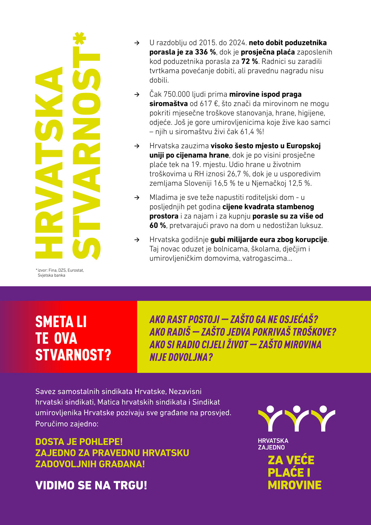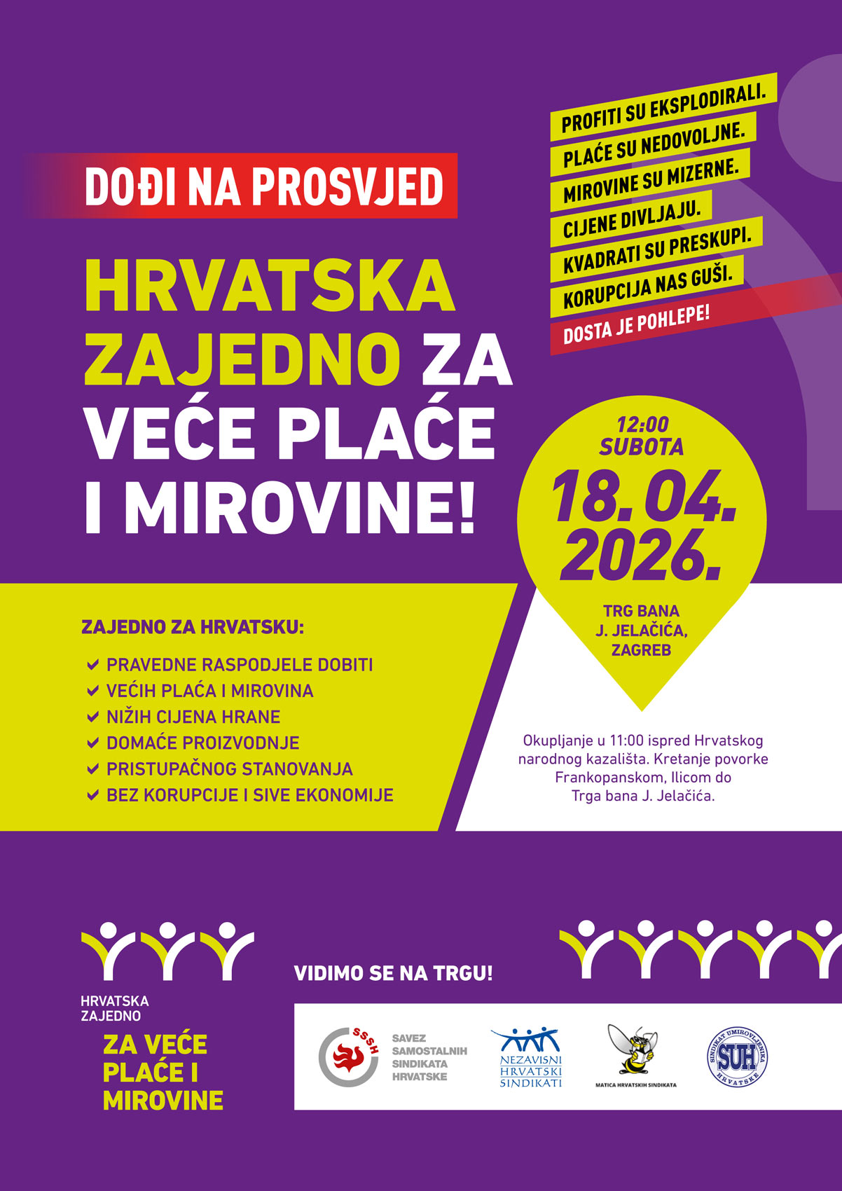 NHS- Sindikati pozivaju građane na prosvjed zbog niskih plaća i mirovina 9. travnja 2026.Izor: HRT Tri sindikalne središnjice i Sindikat umirovljenika Hrvatske (SUH) pozvali su sve građane koji zbog malih primanja i visoke inflacije ne mogu podmiriti osnovne životne troškove da dođu na prosvjed "Hrvatska zajedno za veće plaće i mirovine" koji će se u subotu, 18. travnja u podne održati na zagrebačkom Trgu bana Jelačića.