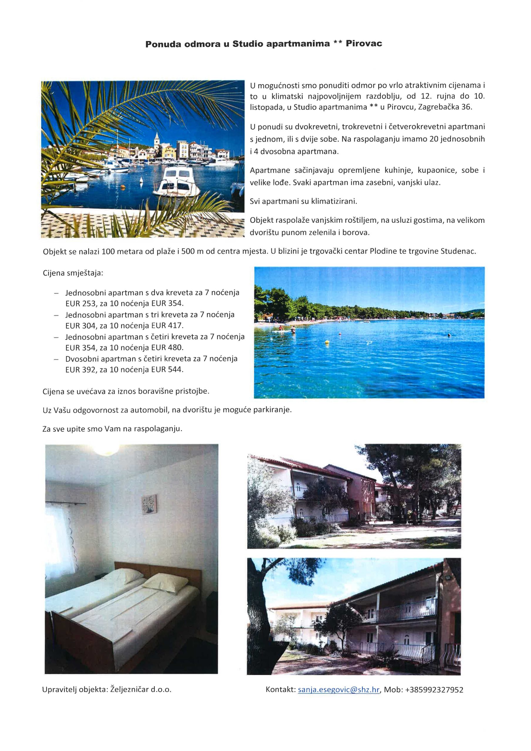 Sindikat hrvatskih željezničara poslao je našim članovima ponudu za ljetovanje u Studio apartmanima ** Pirovac . Za sve dodatne informacije i rezervacije kontaktirati u radno vrijeme: Sanja Ešegović Tajnica SHŽ na mobitel 0992327952 ili e-mail: sanja.esegovic@shz.hr
